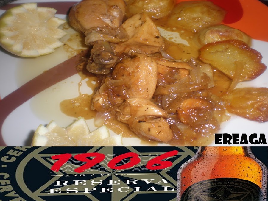 6º - Cuando ya esté listo el pollo y la salsa un poco gordita , retiramos y servimos con las patatas que hemos asado en el horno .