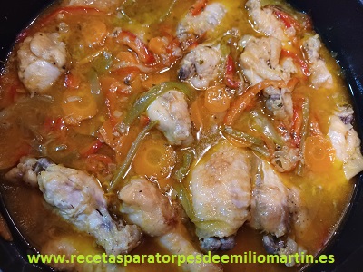 Ponemos la olla express al fuego, colamos y echamos en la olla el aceite de freír el pollo, cuando este caliente agregamos las verduras, rehogamos unos minutos, a continuación ponemos los trozos de pollo (con el jugo que hayan desprendido), rehogamos, el azafrán, el mortero con el majado y el vino blanco, dejamos que evapore el alcohol.