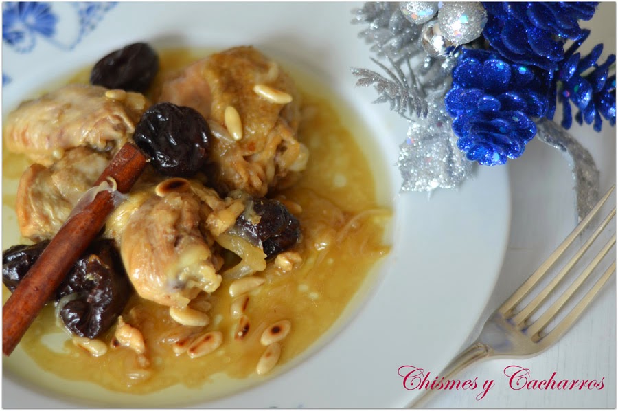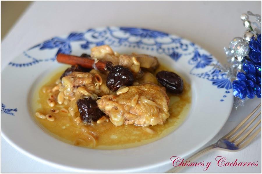 Mientras se hace el pollo, poner a remojo las ciruelas en agua templada y tostar los piñones en una sartén. Pasados los 30 minutos añadir las ciruelas (escurridas), los piñones y dejar cocer 10 minutos más.