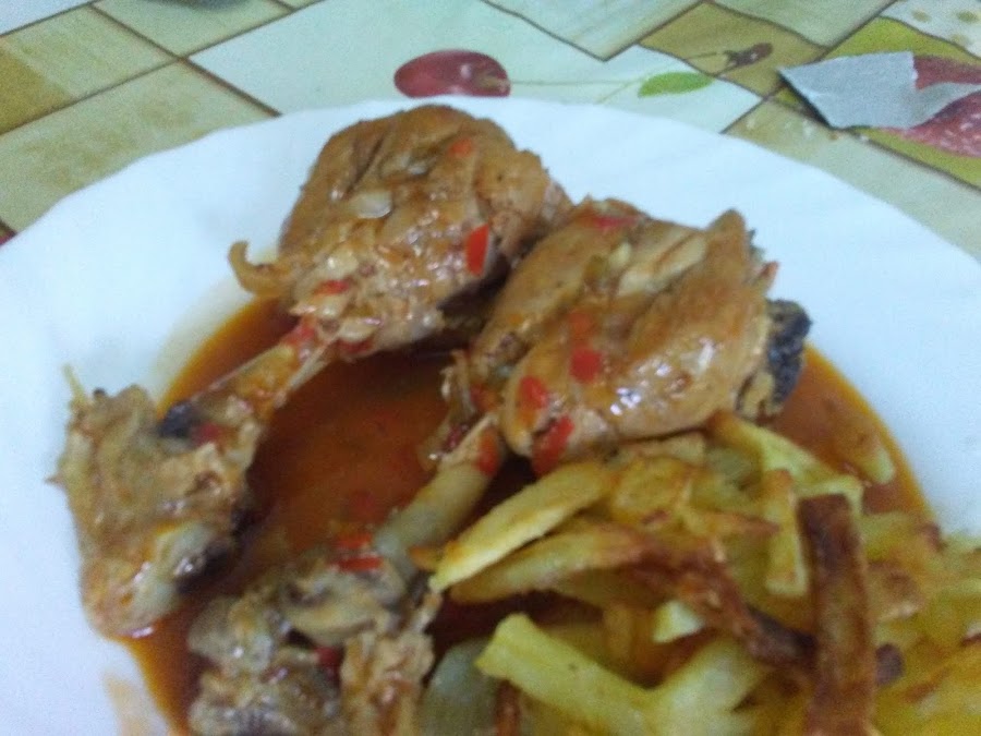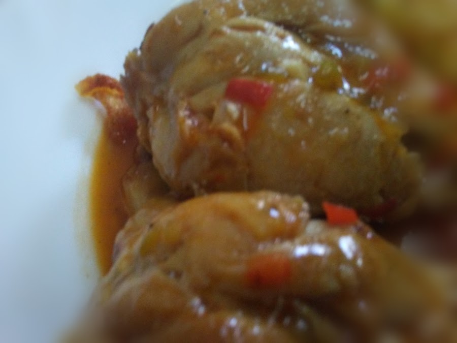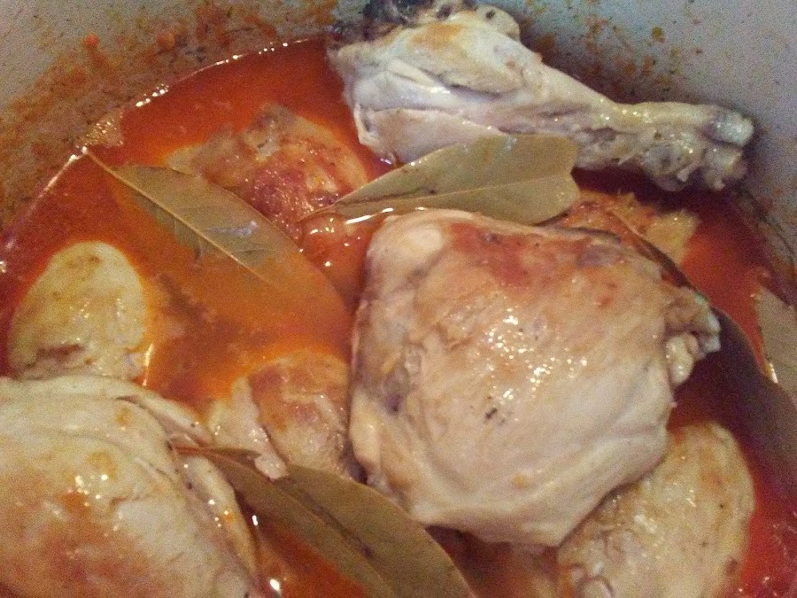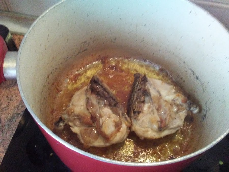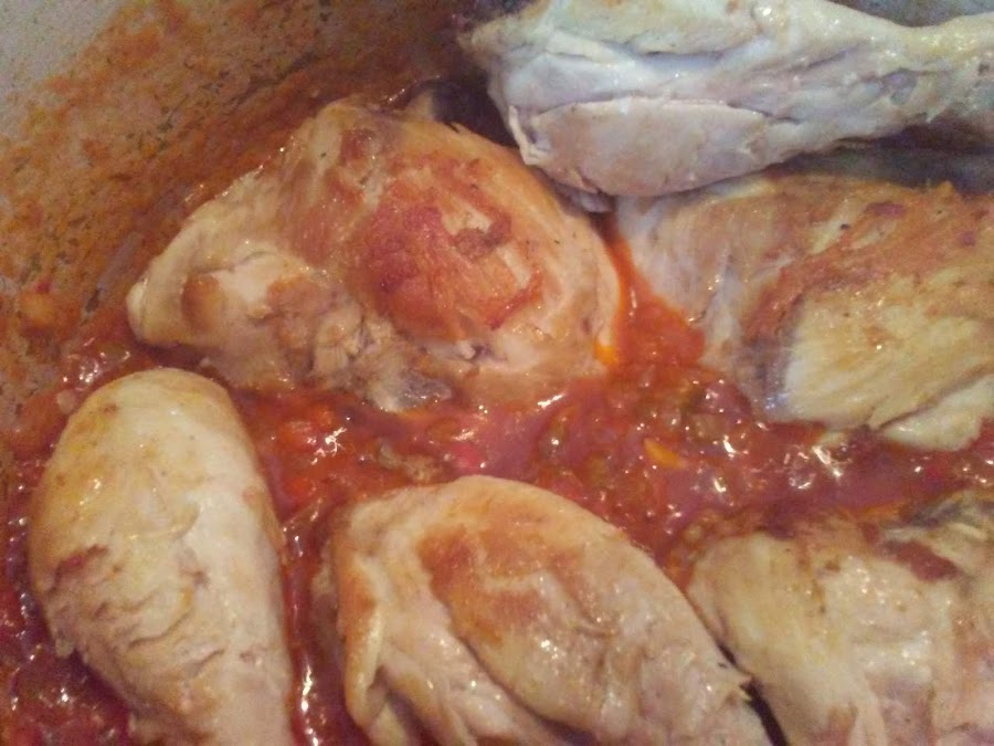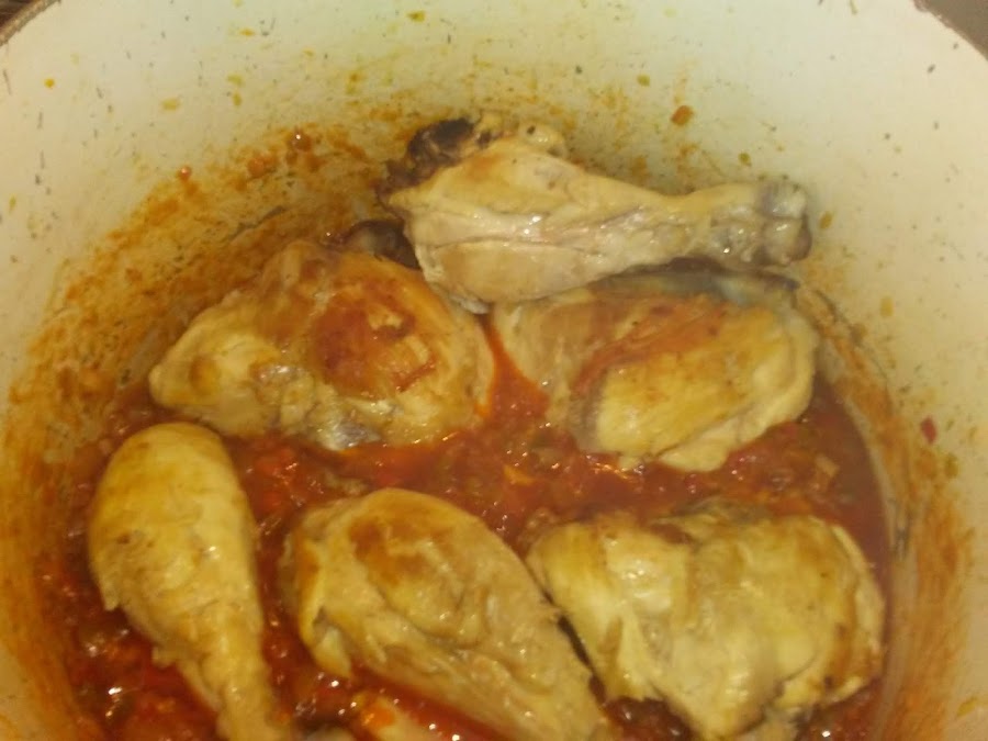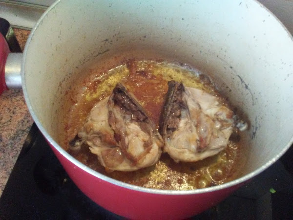 Añadir el caldo de pollo, reducir el fuego y añadir tambien las especias...ydejar que reduzca la salsa y que el pollo se ponga tierno.....