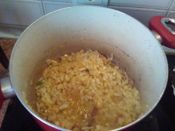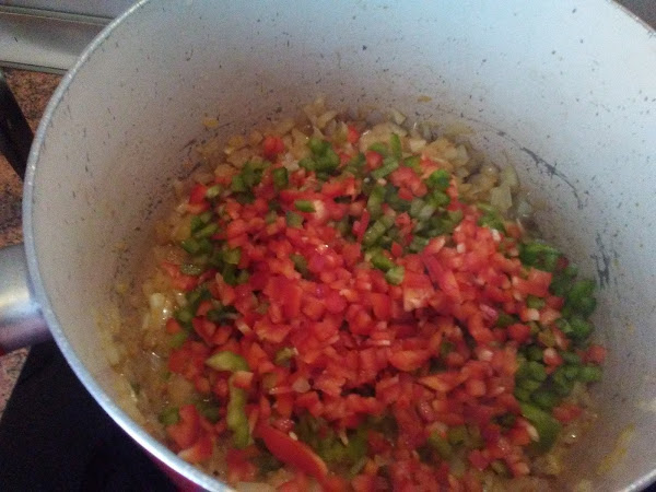 Cuando toda la verdura esté bastante pochada, añadir el tomate, yo como no tenía, le añadí un poco de tomate frito, el efecto es el mismo....