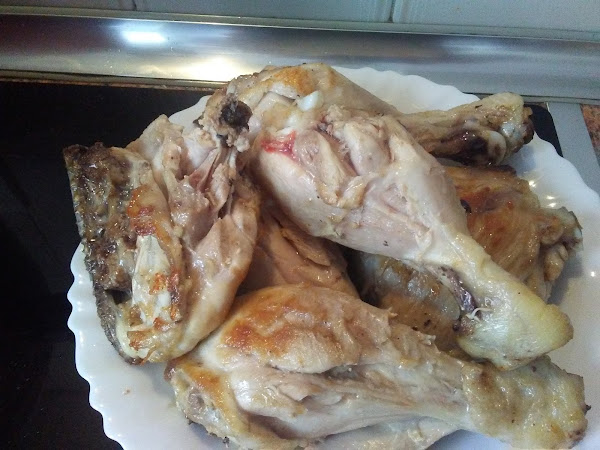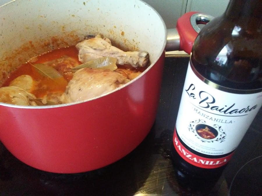 Colocar las piezas del pollo en la verdura, añadir el vino manzanilla o en su defecto, vino blanco, aumentar el calor en la olla para que se evapora el alcohol...