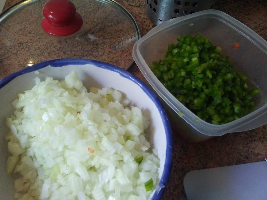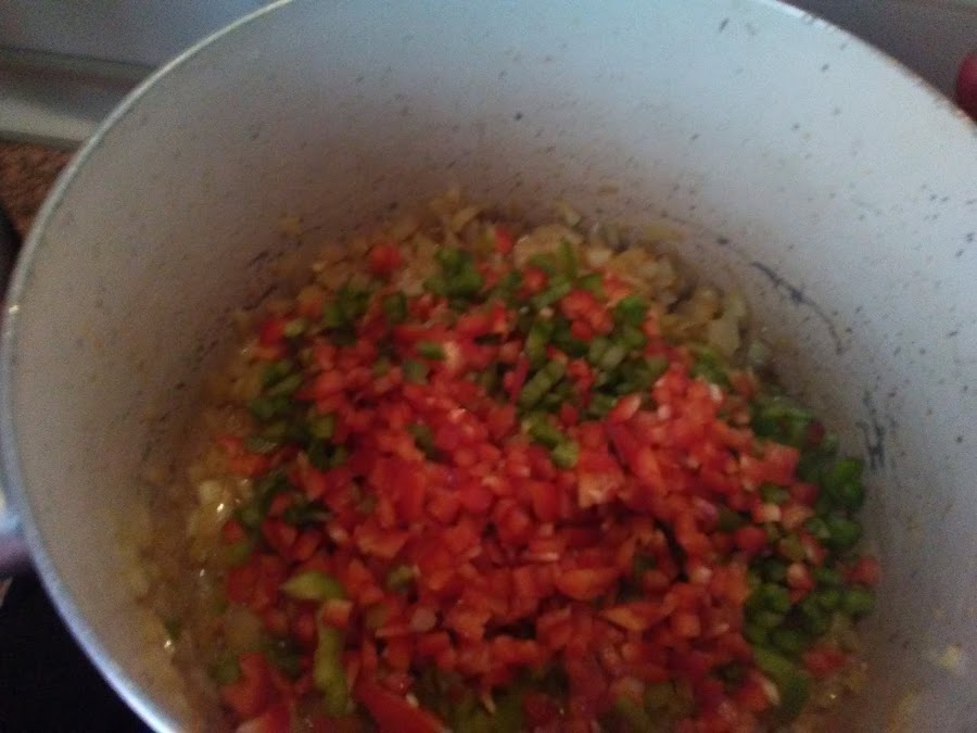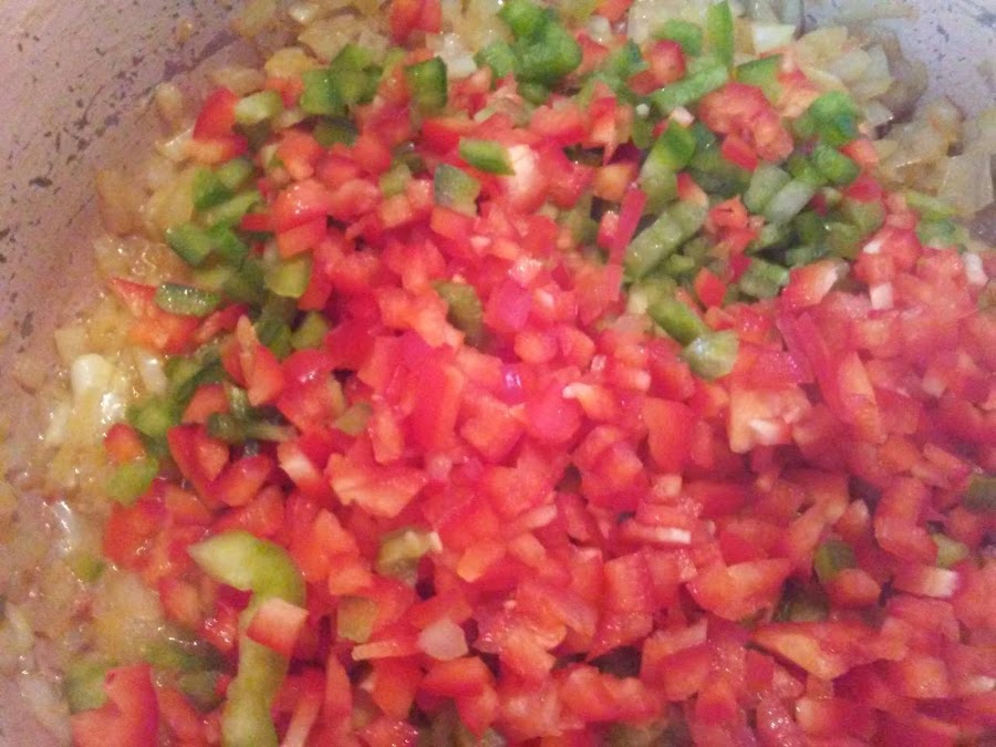 Una vez dorada la carne de pollo y sacado, añadir las cebollas y los pimientos cortados en brunoise y dejar pochar bastante.