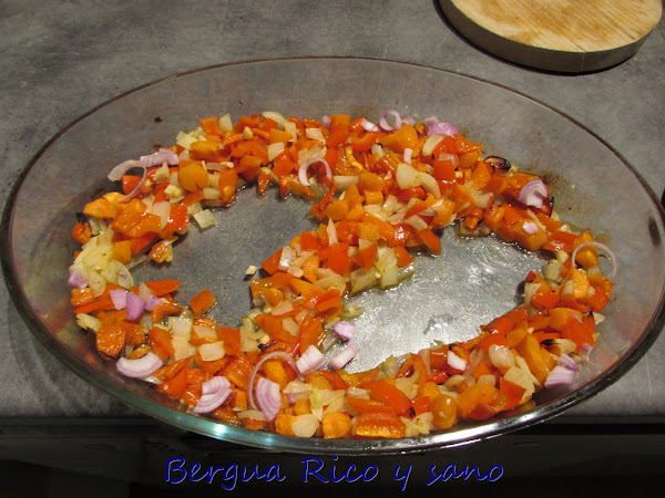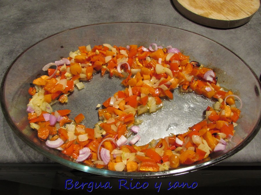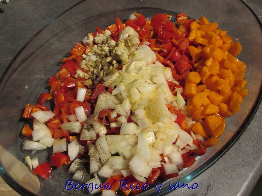 1. Preparamos las verduras: cortamos en trocitos toscos la cebolla pelada, el pimiento y la zanahoria (pelada o no, al gusto). Picamos el ajo, salpimentamos todo y mezclamos. Rociamos con un chorrito de vino blanco y un xhorro de aceite, mezclamos de nuevo y le damos 10-15 minutos en el horno precalentado a 190°C.