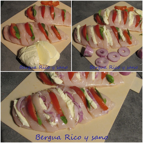 3. Rellenamos las rajas: Yo pongo rodaja de mozzarella en una, rodaja de tomate en la siguiente y albahaca escondida entre el tomate y el pollo para que no se queme la hojita. Y como veis, también pongo una rodajita de cebolla con la mozzarella, porque me gusta mucho cómo queda. Salpimentamos.