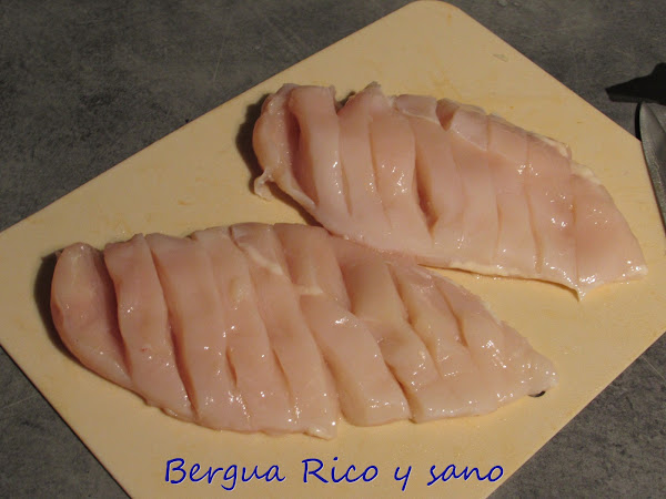 2. Mientras tanto preparamos el pollo: Hacemos cortes trasversales sobre la cara de arriba, pero sin llegar a cortar del todo; es decir, queremos abrir rajas en la pechuga, no cortar tiras de pollo.