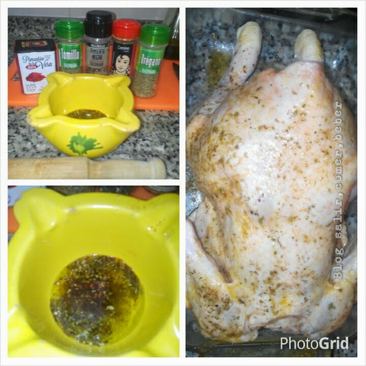 En un mortero ponemos la sal gorda, las especias a gusto, el ajo, el aceite y machacamos bien. Limpiamos bien el pollo, eliminando las posibles plumas y untamos con el majado todo el pollo.