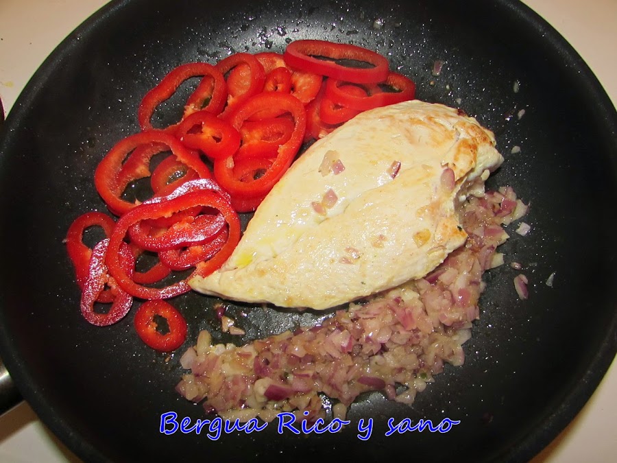 6. Para el pollo picamos una cebolla y el pimiento lo cortamos en aritos finos. Calentamos 3-4 cucharadas de aceite en una sartén y rehogamos la cebolla. En seguida incorporamos el pollo para que se dore. Cuando el pollo esté dorado, añadimos los aros de pimiento y rehogamos un par de minutos.