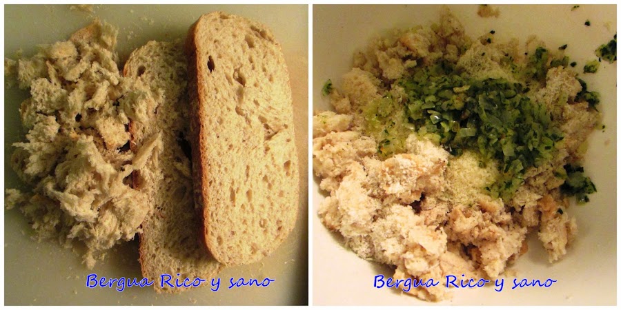 1. El truco de estos ñoquis es que son de pan, no de harina, y eso nos facilita mucho el trabajo. Los podemos dejar preparados para hervirlos al final, y lo haremos así: Desmigamos las rodajas de pan y rociamos la miga con la leche. No tiene que quedar empapado, es para que se vaya ablandando.