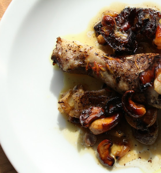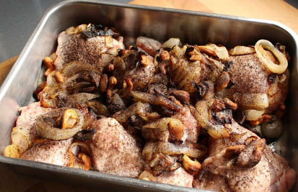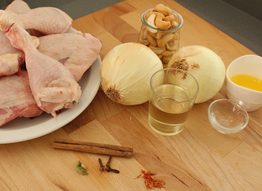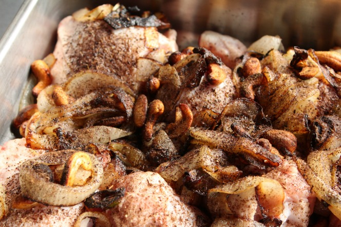 En una fuente de hornear, ponemos los trozos de pollo y salpimentamos. Añadimos el sofrito de cebolla y anacardos y espolvoreamos con las especias.