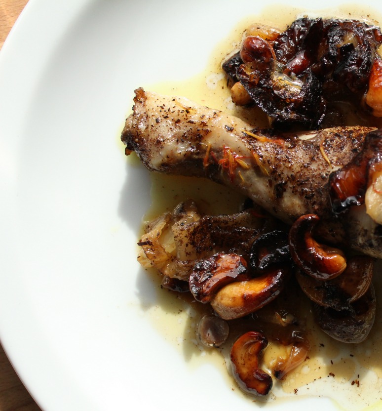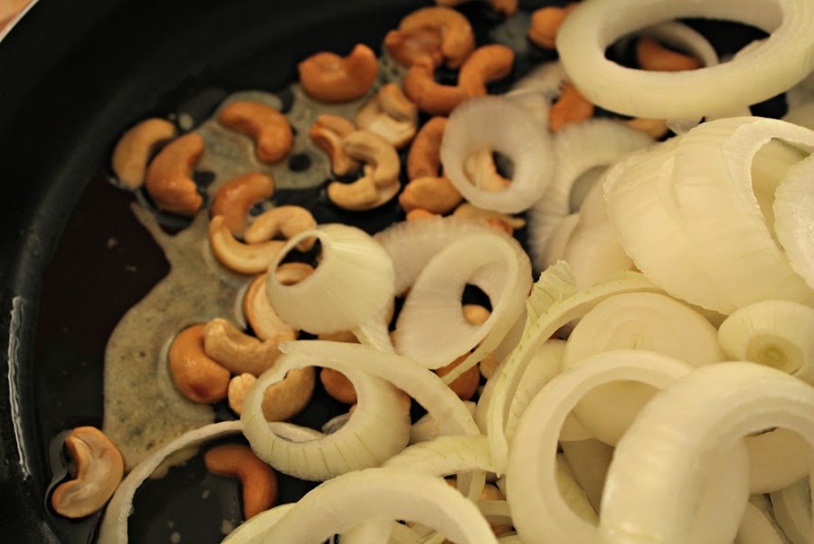En una sartén, ponemos la mantequilla clarificada y una cucharada de aceite de girasol y doramos las cebollas con los anacardos.