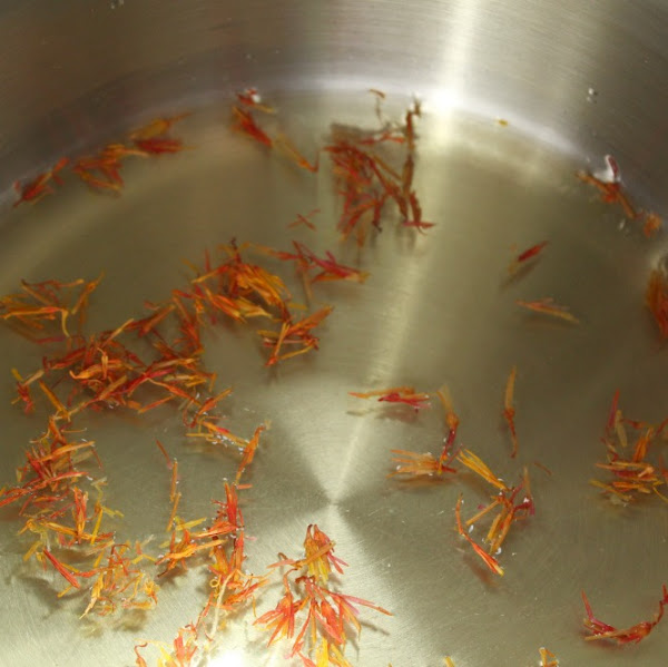 Mientras, en un cazo pequeño, ponemos el azafrán, el agua de rosas y 8 cucharadas de agua. Calentamos, aproximadamente 3 minutos.