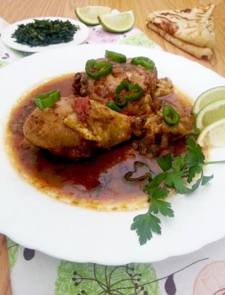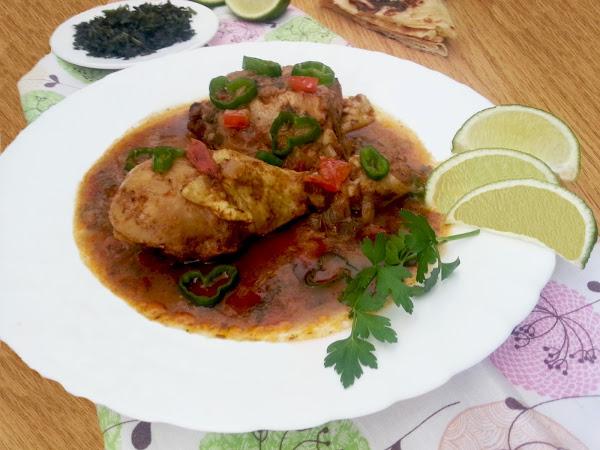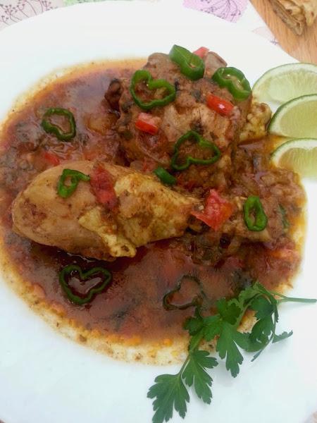 En el recipiente donde prepararemos el pollo, poner aceite a calentar, agregar las cebollas cortadas en rodajas, freirás un par de minutos, agregar los tomates, finamente picados, dejar freír unos minutos mas, agregar el jengibre en pasta, mezclar, luego la cucharada de pasta de ajo y revolver muy bien, dejar cocer tapado por aproximadamente 5 minutos. Levantar la tapa y agregar la guindilla en polvo, la cúrcuma, la sal, el chile cortado en láminas, revolver muy bien y agregar el pollo troceado. mezclar, agregar encima unas 4-5 cucharadas de cilantro picado y regar las especias que hemos molido al principio, agregar el agua, revolver todo y rectificar de sal, tapar y dejar cocer por 20 minutos o hasta que el pollo este hecho.
