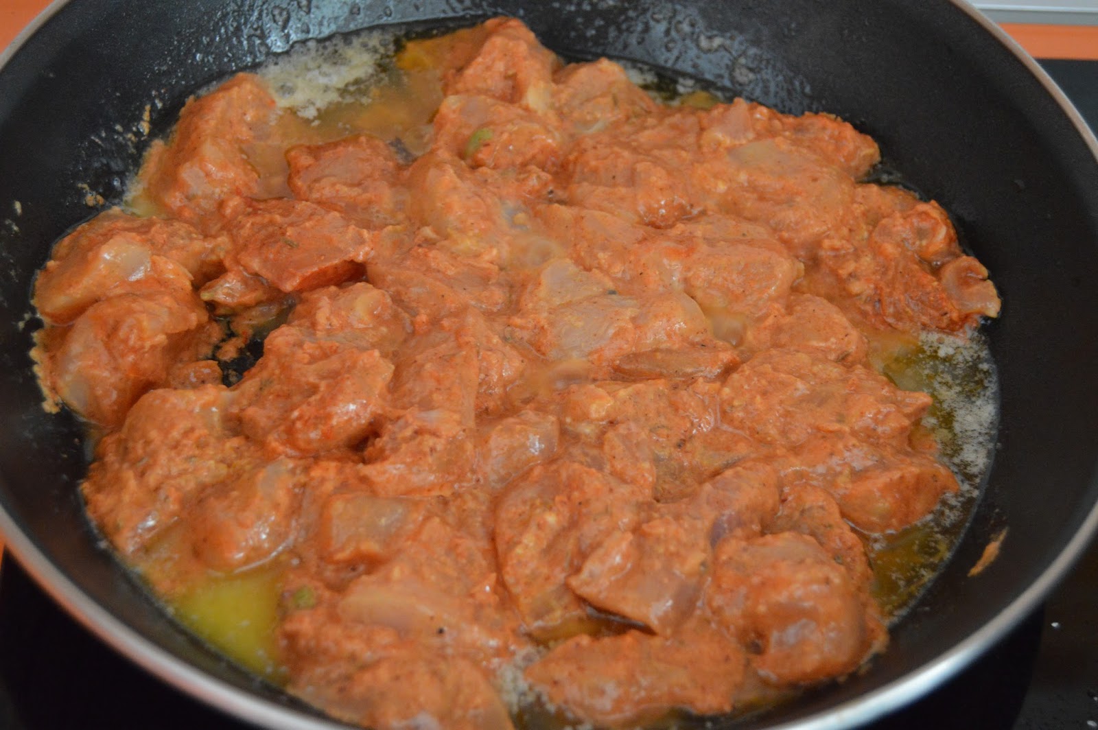 1 pechuga de pollo, 150 gr de nata (crema de leche) o de crema espesa, 1 yogur griego, 25 gr de mantequilla, 2 cucharadas de masala, jengibre fresco rallado, curry, cominos, colorante indio rojo o en su defecto pasta de tomate (tomate concentrado), pimentón, arroz basmati, semillas de cardamomo, sal y pimienta.