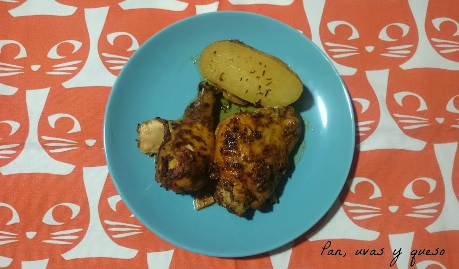En un bol mezclamos todos los ingredientes del aliño. Colocamos el pollo en un bol y lo untamos con el aliño, dejándolo en la nevera marinándose durante 12 horas.