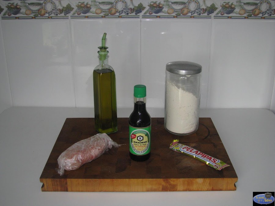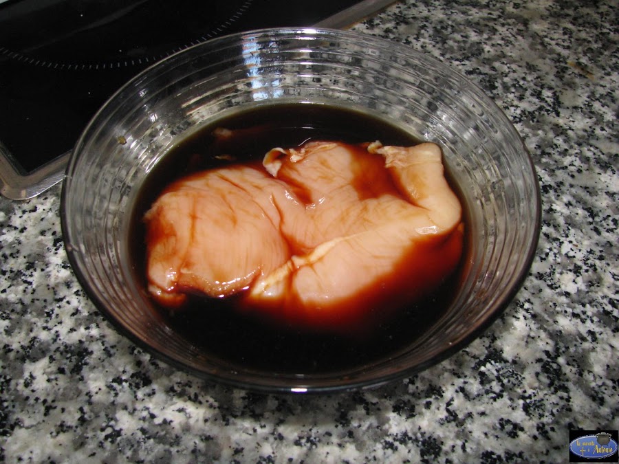 Primero ponemos a marinar el pollo con la salsa de soja durante 2 horas.Yo he utilizado la salsa de soja de Kikkoman que tiene menos sal que es la del envase verde.Y la razón de inclinarme por ella me la dio mi mujer ya que yo no me había dado cuenta y es que las pipas van a aportar bastante sal al pollo cuando lo rebocemos con ellas.Así que de esta manera equilibramos un poco.