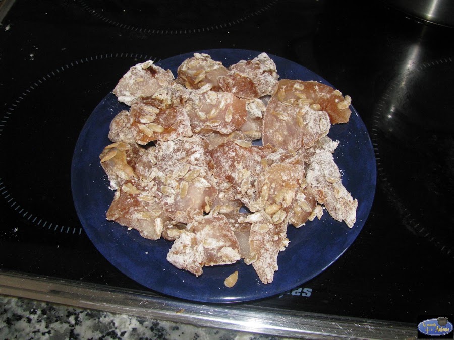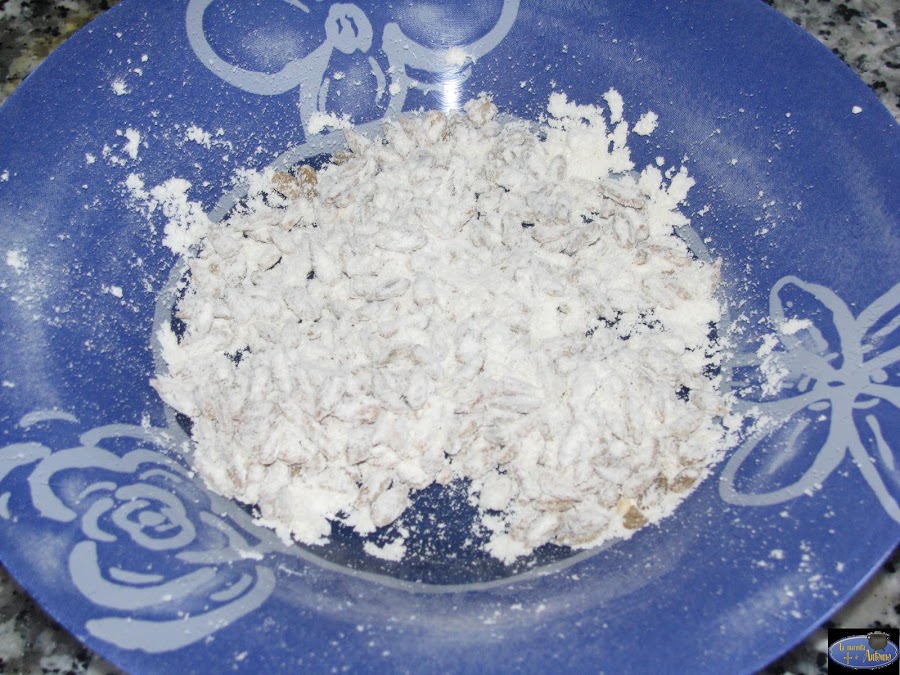 Mezclamos un poco de harina con las pipas de girasol y rebozamos el pollo.A continuación lo freímos en aceite de oliva.