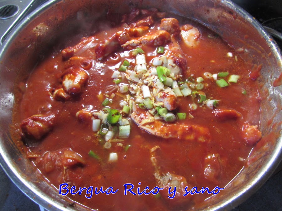 2. Bajamos el fuego a medio-bajo y añadimos dos cucharadas más a la cazuela. Incorporamos la cebolla cortada en trozos y doramos/pochamos. Añadimos entonces el puré de tomate, la pasta de tomate, ajo picado o prensado, cebolletas picaditas, jengibre rallado, copos de guindilla, agua y sal. Mezclamos bien.