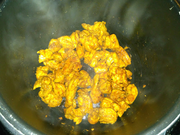 En la cubeta de la olla colocamos 2 cucharadas de aceite y en menú sofreir a 160º doramos los trozos de pollo.