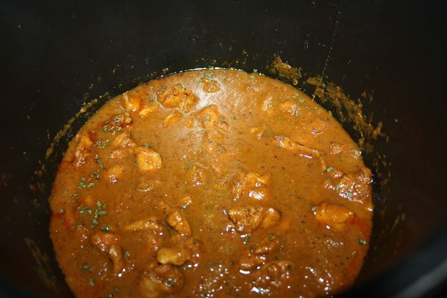 Incorporamos las almendras, y la salsa, cancelamos menú y programamos menú guiso, presión media, 4 min a 130º. Cuando pite despresurizamos, espolvoreamos cilantro en hoja, removemos y dejamos reposar 5 min.