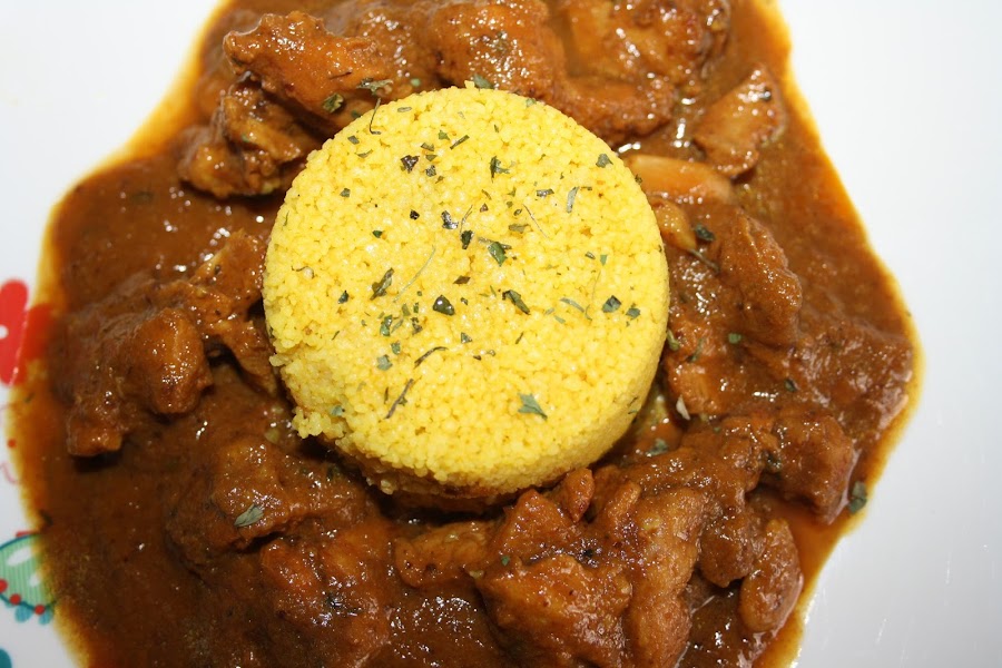 Para el cuscus: Calentamos el agua junto con el ras al hanout y la cúrcuma al gusto. Se lo añadimos al cuscus, junto con un poco de sal y aceite, mezclamos bien y dejamos reposar.