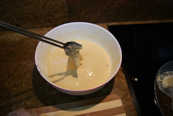 Y vamos rebozando el pollo en la tempura que hemos hecho.