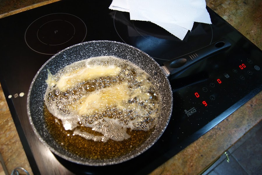 Freímos las tiras de pollo y las vamos dejando en papel absorbente para que suelte el exceso de aceite.