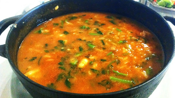 Este arroz con langostinos y almejas tenía demasiado cilantro para el gusto de los que lo probamos