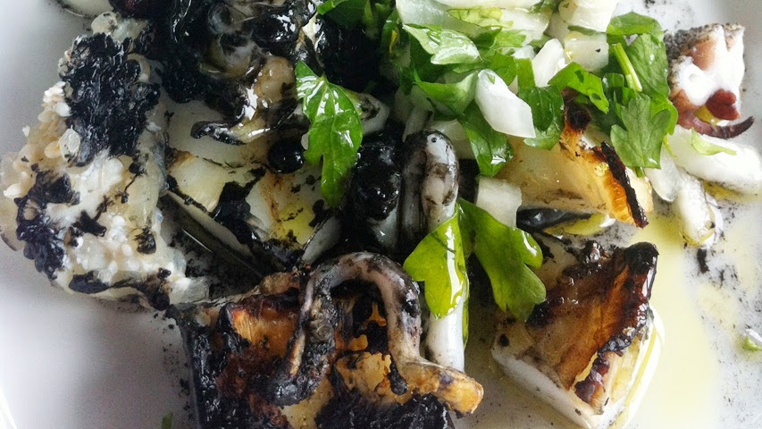 La jibia (sepia o choco) también estaba deliciosa a la parrilla y un mejunje hecho con su tinta, aceite de oliva, ajo y perejil