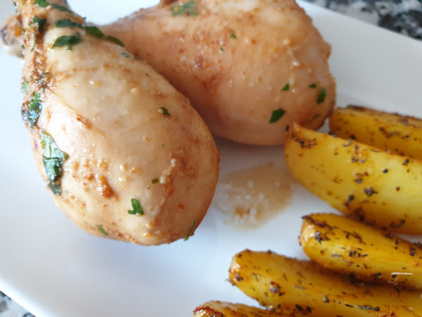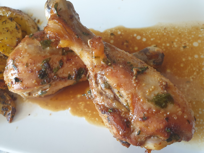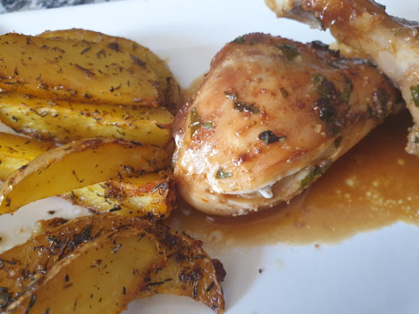 Coloque los muslos en una bandeja de horno sobre una hoja de papel de horno, en una sola capa para que se cocinen uniformemente y vierta sobre la marinada restante. Hornee durante 45 minutos. Perfore la parte más gruesa de un muslo con un pincho; los jugos deben quedar limpios.