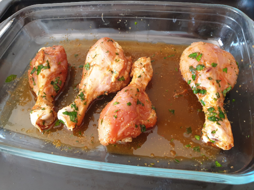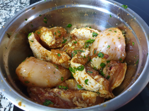 Coloque los muslos en un recipiente con tapa y vierta la marinada, asegurándose de que todas las superficies del pollo estén cubiertas.