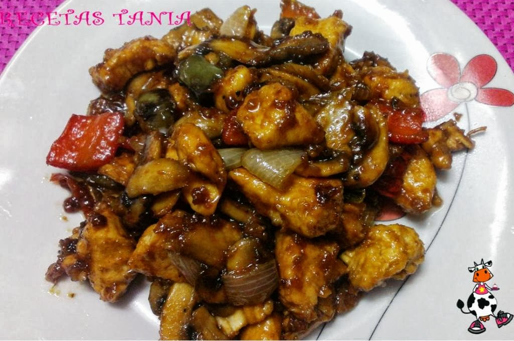 Ponemos el Wok al fuego con un chorrito de aceite de oliva (puedes usar cualquier caldero). Troceamos la cebolla y los pimientos en cuadraditos, pasamos por harina, lo vamos poniendo en el wok y sofreímos. Cortamos los champiñones en láminas y añadimos al wok. Troceamos la pechuga de pollo, pasamos por harina y añadimos al wok,removemos todo bien. Partimos una pimienta y añadimos al gusto,(mas picante mas pimienta,menos picante,menos pimienta). Ponemos medio vaso de salsa de soja y 1 cucharada de azúcar,removemos y añadimos al wok. Mezclamos todo bien,bajamos el fuego y dejamos unos 10min. Apagamos el fuego dejamos que repose un poco y a comer. Está riquísimo!!! ;)
