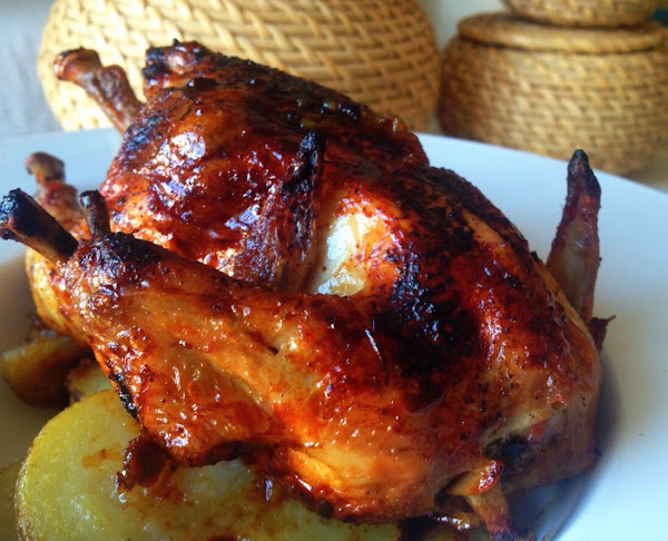 Este plato se puede acompañar con patata al horno o gajos de manzana horneada (se corta la manzana 15 minutos antes y se dispone en la fuente para que se horne junto con los jugos del pollo)
