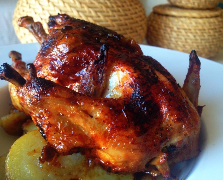 Precalentamos el horno a 180º durante 10 minutos y en una fuente para hornear disponemos los pollos, salpimentando al gusto por dentro y por fuera y rociamos con un hilo de aceite.