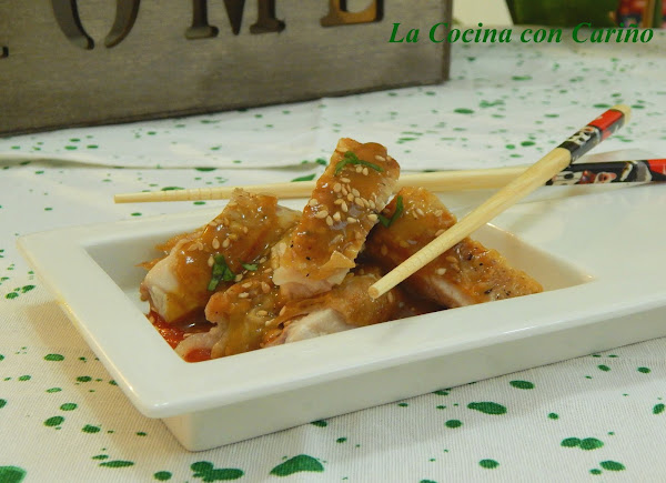 Cortamos el pollo en tiras y lo colocamos sobre una cama hecha de salsa agridulce de tomate. Napamos con la salsa del pollo y listo. Una delicia. Así que Besos a todas, besos a todos, besos a……, en fin, besos, siempre muchos besos.