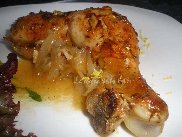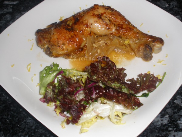 Disponemos los muslos encima de la cebolla con la parte de la piel entera hacia arriba, y rallamos el otro limón y espolvoreamos por encima de la bandeja.