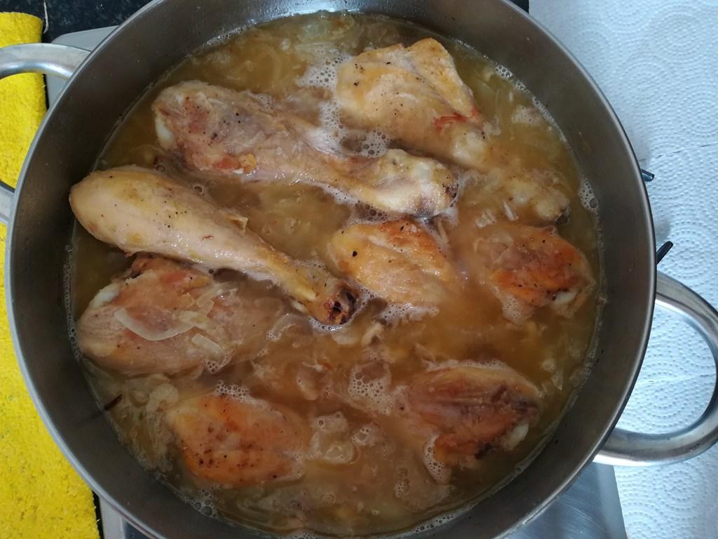 Añadimos el pollo. Removemos, que se mezclen los ingredientes, rectificamos de sal si fuera necesario y dejamos cocer al “chup-chup” hasta que el pollo esté tierno.