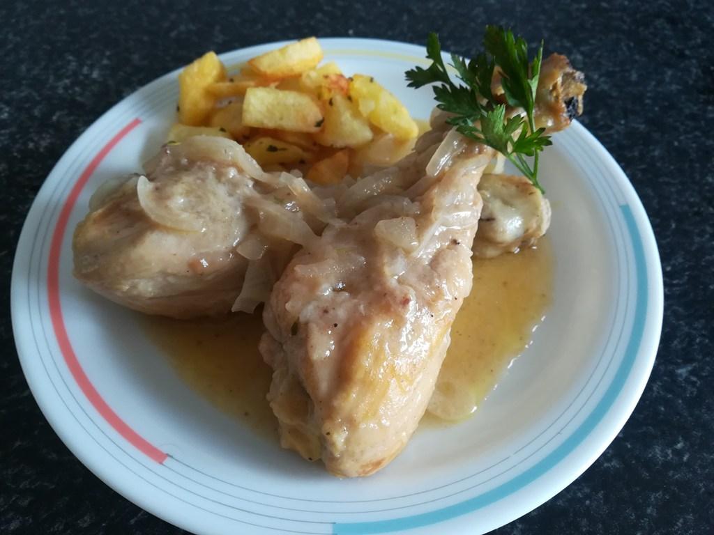 Es una delicia, sobre todo la salsa que queda muy melosa. Lo podemos servir con una guarnición de verdura, un puré de patata, o como en éste caso acompañado de unas patatas fritas.