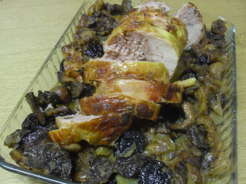 El relleno que puse eran salchichas, castañas cocidas, pasas, piñones. De guarnición lo acompañé de níscalos, castañas y ciruelas. Y una buena salsa de cebolla y castañas con el resto del rustido.