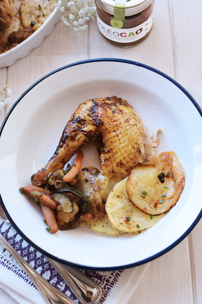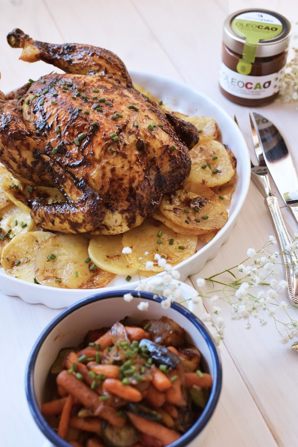 10. Llevamos el pollo al horno durante 15 minutos. Pasado el tiempo, lo sacamos, le damos la vuelta y lo volvemos a barnizar con la salsa de OLEOCAO. Metemos de nuevo al horno otros 15 minutos. Debemos repetir este proceso 3 veces, sacando el pollo cada 15 minutos, para que no se reseque la piel. Con una cuchara podemos remover las verduras y bañar el pollo con el jugo que va soltando.