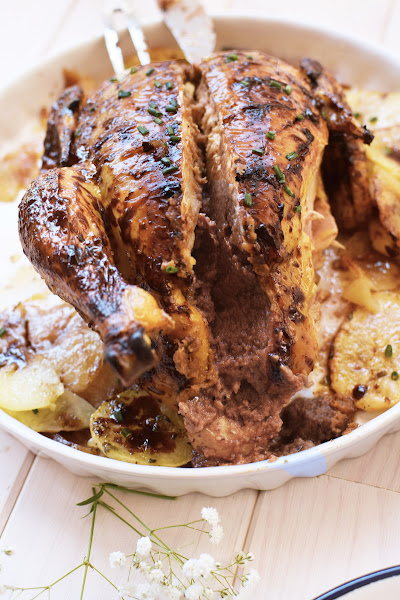 12. Una vez listo, sacamos del horno el pollo, servimos acompañado de la guarnición y lo regamos con la salsa que ha ido soltando en el horneado. Decoramos con cebollino picado.