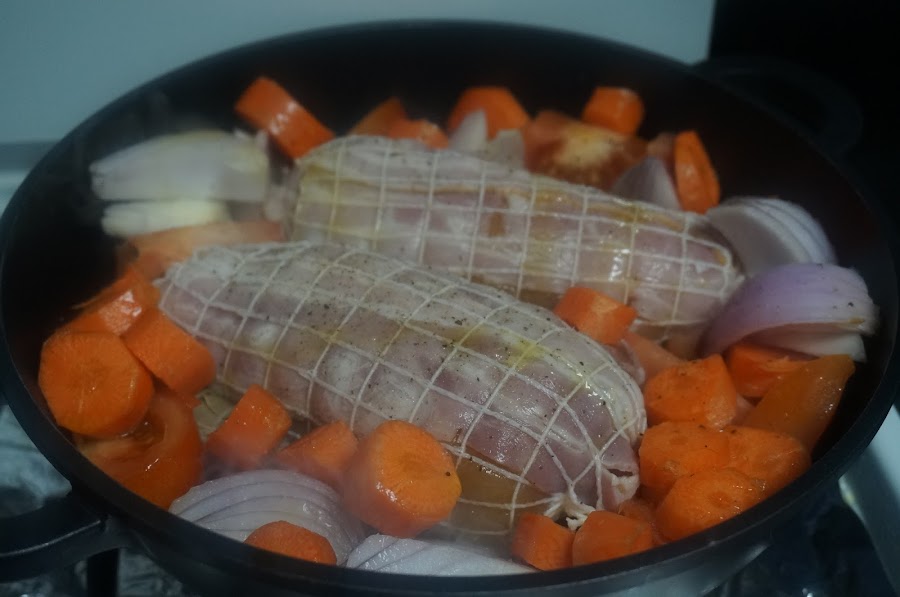 Ponemos una cazuela a calentar con un buen chorro de aceite, cortamos las verduras y las ponemos en la cazuela junto a los redondos , el atado de hierbas , la sal y la pimienta.