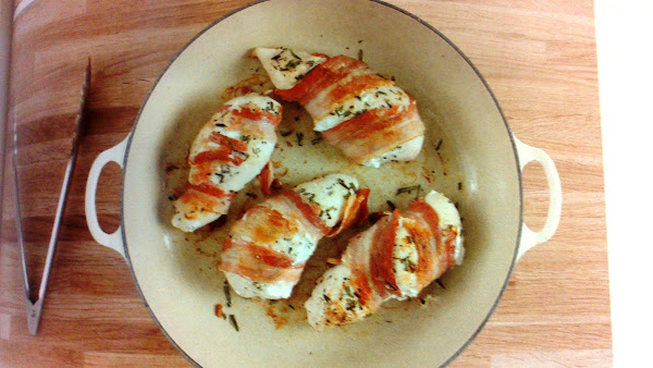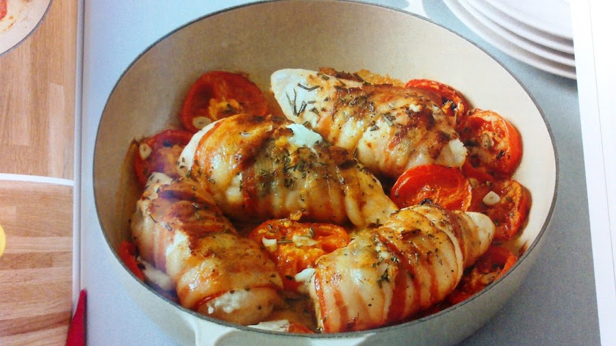 Salpimentamos el pollo y esparcemos la mitad del romero. Envolvemos cada trozo de pollo con 2 lonchas de beicon y las apretamos bien intentando que no queden los extremos sueltos.