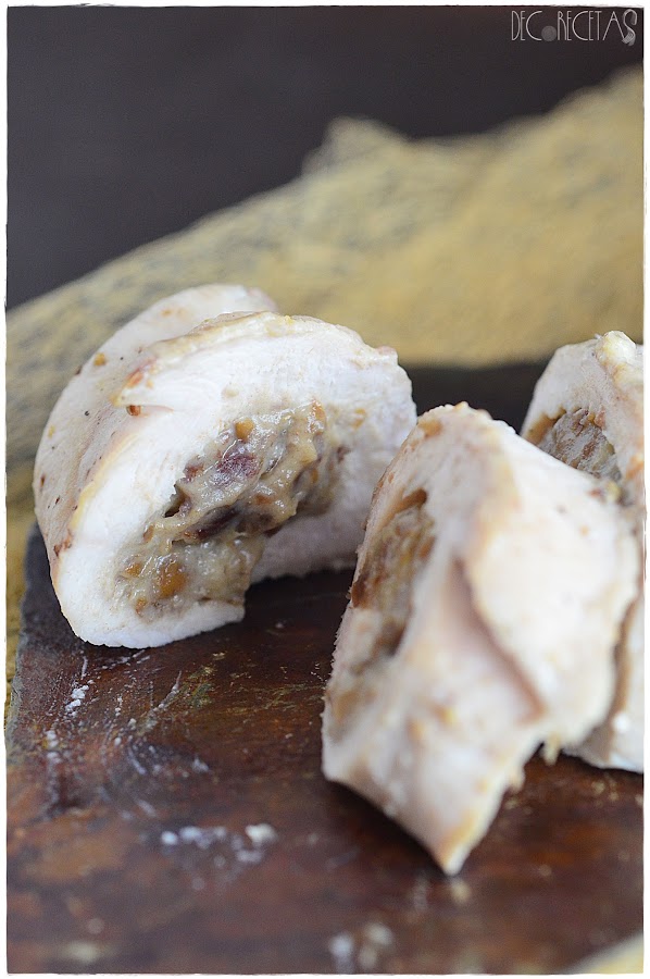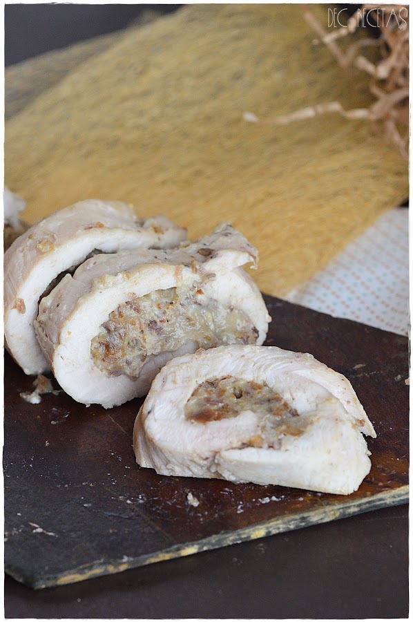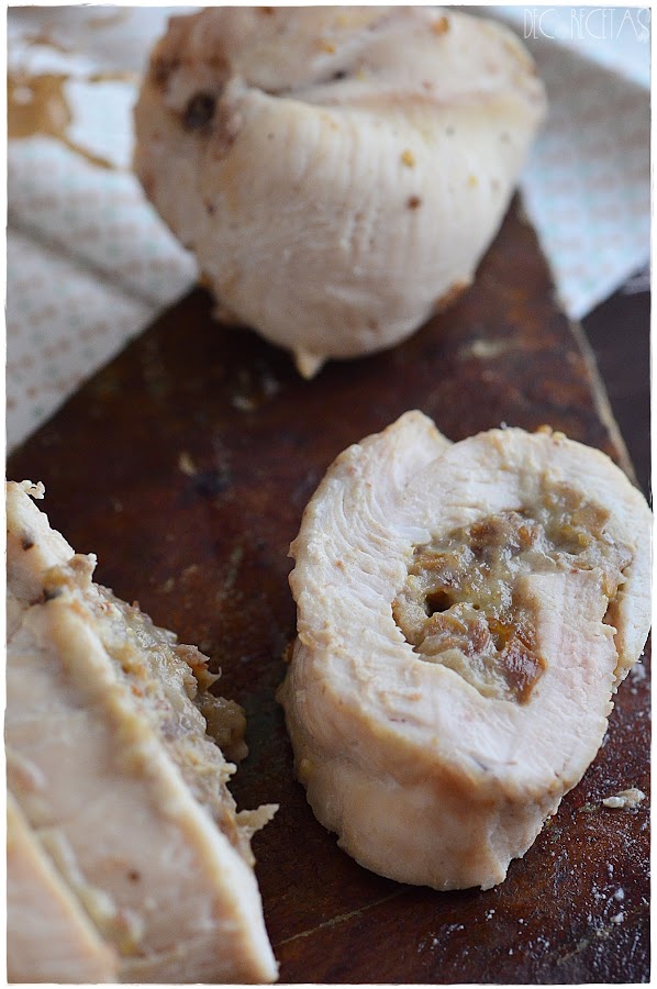 Hice la tradicional receta que trata de triturar conjuntamente los 100gr de dátiles, con 80gr de queso azul y 200gr queso crema tipo philadelphia. Esta mezcla la deposite dentro de una pechuga de pollo abierta totalmente, y enrolle como si fuera un brazo gitano, envolviéndola en un papel film transparente haciendo un rulo perfecto, que deposite dentro de una olla a presión con dos dedos de agua. Cerré la olla y una vez subió la válvula, dejé cocinando 5 minutos. Lo saqué y dejé enfriar