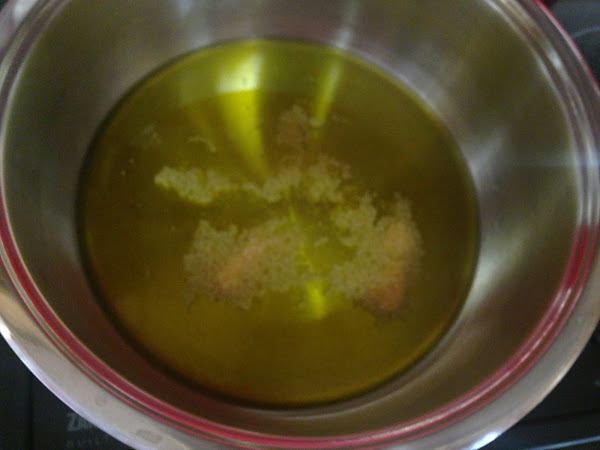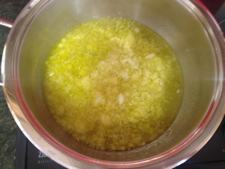 Pondremos una cazuela en el fuego con aceite de oliva. Echaremos el ajo picado en polvo y la cebolla picada.
