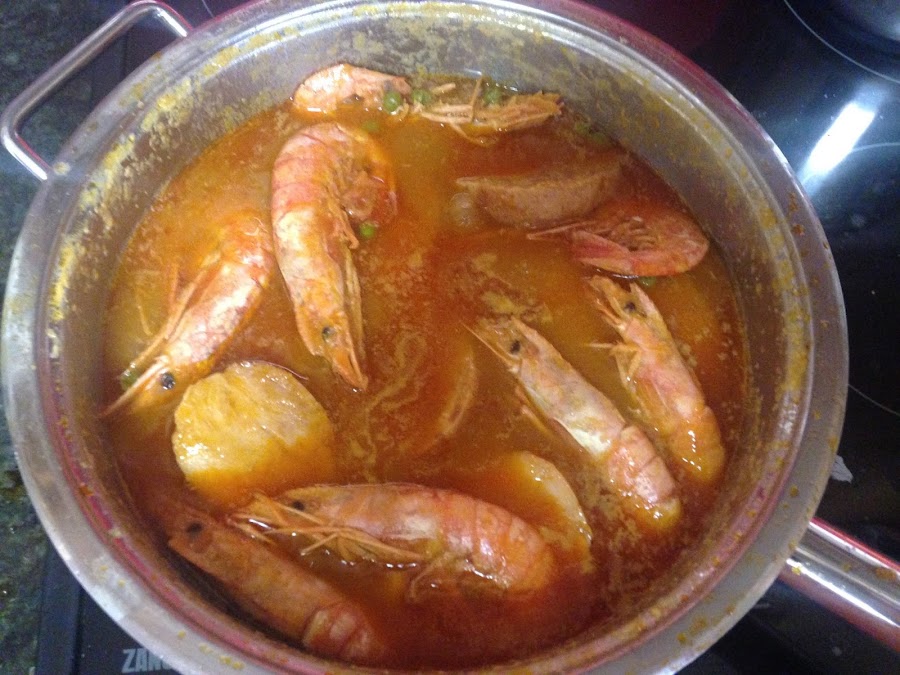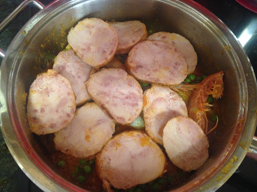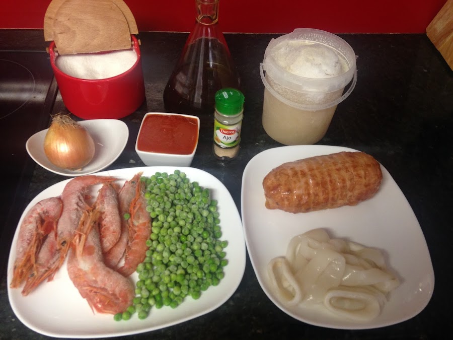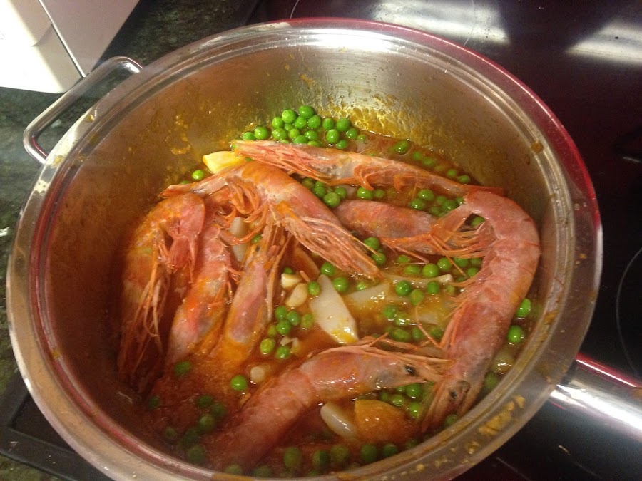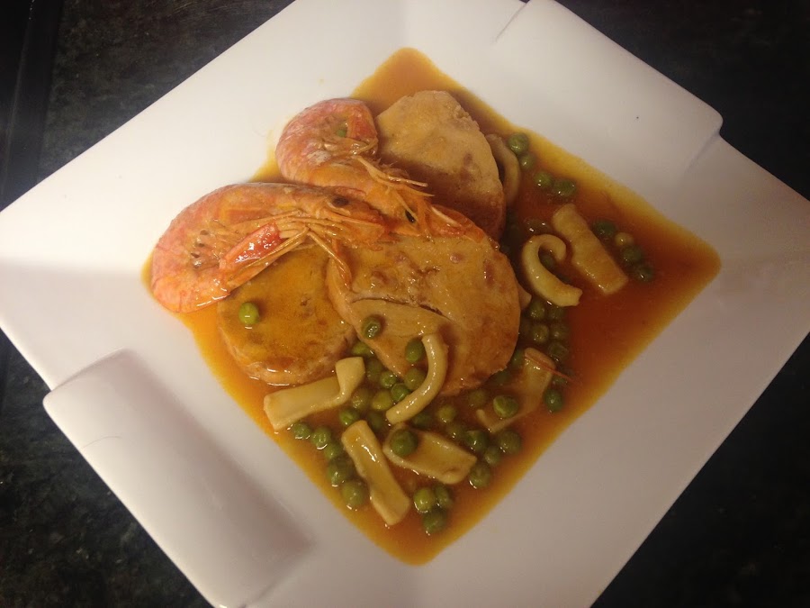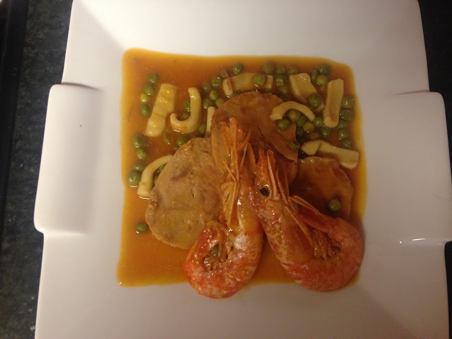 A la salsa agregamos el calamar, los guisantes y las gambas argentinas.