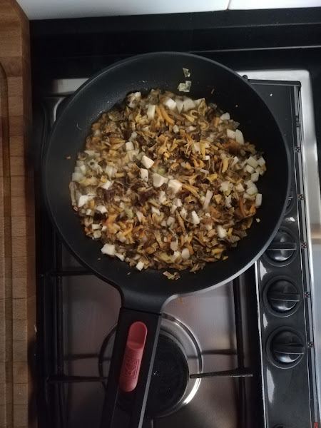 1. Empezaremos por poner a hacer el relleno: en una sartén pondremos a pochar el puerro con un chorrito de aceite y un poco de sal. Cuando esté blando, le añadiremos las setas que habremos picado a daditos y las gambas también picaditas. Rectificaremos de sal y pimienta y dejaremos a fuego suave hasta que se haya evaporado el agua de las setas. Reservaremos en un bol para que se enfríe.