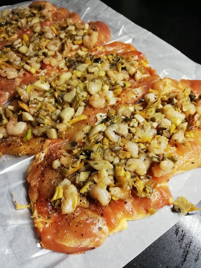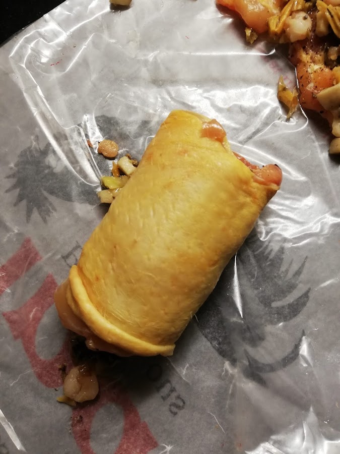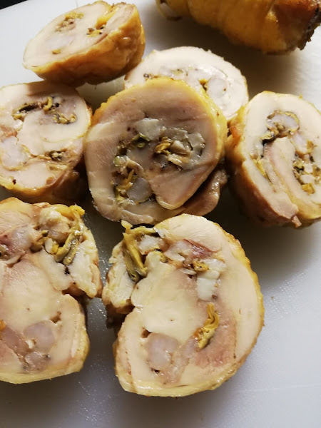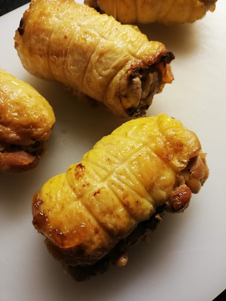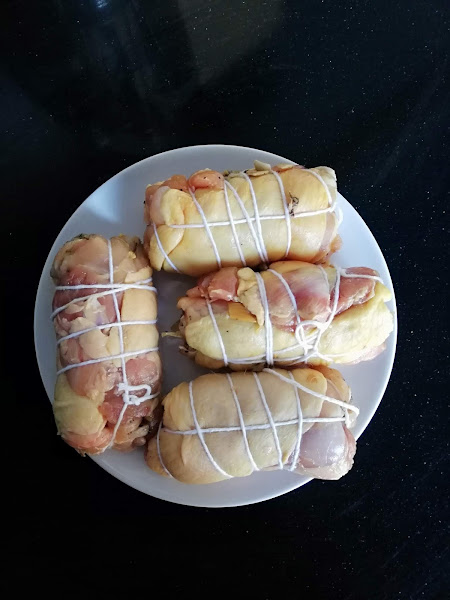 2. Ahora vamos a por el pollo: lo salpimentaremos por los dos lados y procederemos a rellenarlo. Pondremos un poco de relleno en cada uno y lo enrollaremos sobre si. Una vez los contramuslos rellenos, los envolveremos con film plástico bien prensado (en forma de caramelo) y los dejaremos en la nevera para que cojan bien la forma. Yo lo hice el día de antes, pero con un par de horas ya sería suficiente. Luego quitamos el film y los atamos. Mira las fotos.