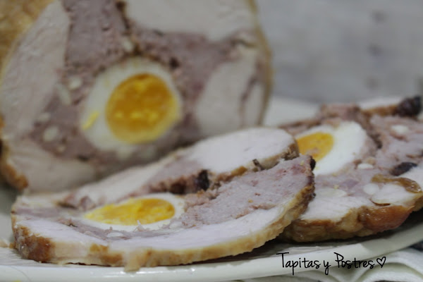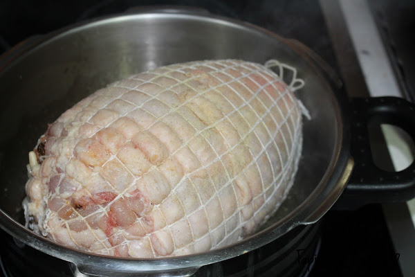 Sazonamos la pechuga con sal y pimienta por dentro. Extendemos el relleno por toda la pechuga y aplastamos bien. Colocamos los dos huevos cocidos en el centro y enrollamos cerrando la pechuga de manera que quede cubierta por la piel. Nos quedará un rulo grande. Metemos este rulo en una redecilla elástica de cocinar. Este paso es el más complicado. Deberéis contar con ayuda pues sola yo no pude. Cuesta un poquito pero al final se consigue. Una vez metido el pollo en la redecilla, sazonamos por fuera.