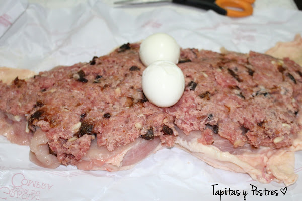 Extendemos el relleno por toda la pechuga y ponemos los huevos cocidos en el centro.
